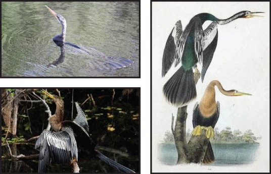Anhinga - Ross Feldner The Anhinga gets its name from a'ñinga in the Brazilian Tupi language and means "devil bird" or "snake bird". The origin of the name becomes obvious when you see an Anhinga swimming with only its neck above water, which makes it look like a snake ready to strike. It is a water bird that lives in the warmer parts of the United States including the Gulf Coast, the Atlantic Coast from North Carolina to Texas and in the Mississippi Valley north to Kentucky and Missouri. Anhingas live in warm shallow waters and swamplands where they stalk fish underwater including mullet, sunfish, and bass as well as shrimp, crabs, cray fish, tadpoles and water snakes. Once they find their prey they open their bills slightly and stab it quickly. This unique bird is one of a few birds that swims underwater. They propel themselves by kicking their webbed feet. Unlike ducks, pelicans and Ospreys who have feathers coated with oil, the Anhinga does not have this aquatic advantage so they become saturated when immersed and so you will often see them sunning with their wings outstretched to dry off. Anhingas are monogamous and pairs often use the same nest year after year. Courtship begins with the male Anhinga soaring and gliding in display for the female and finally marking a potential nest site with leafy twigs. | |