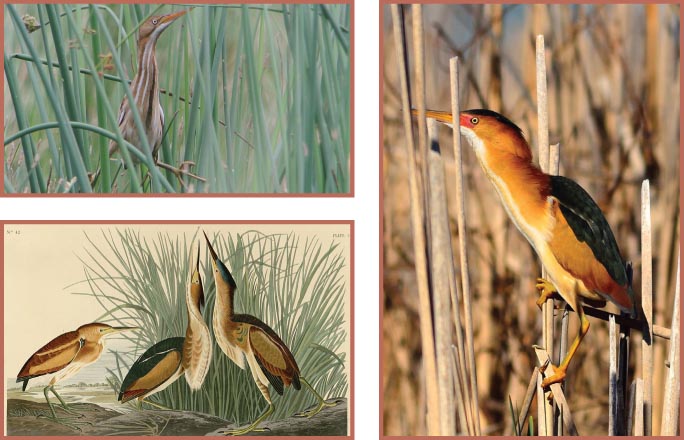 Least Bittern - Ross Feldner This extremely shy bird is the smallest member of the heron family found in America. The Least Bittern is an elusive bird spending much of its time straddling reeds. When alarmed, the least bittern freezes in place with its bill pointing up, turns its front and both eyes toward the source of alarm, and sometimes sways to resemble wind-blown marsh vegetation. This predator-avoidance behavior makes the bittern less vulnerable to many potential predators. Because of its habit of perching among the reeds, the Least Bittern can feed from the surface of water that would be too deep for the wading strategy of other herons. They nest in large marshes with dense vegetation from southern Canada to northern Argentina, building nests from strips of rushes woven together to form a platform and fastened to saw grass growing on the bank of a stream. The nest is well-concealed, usually among cattails and other marsh vegetation. Least Bitterns mainly eat fish, frogs, crustaceans, insects and small mammals, which they capture with quick jabs of their bill while climbing through marsh plants. They also build small foraging platforms at rich feeding sites, catching fast-moving prey that swim by and will use stalks of plants as stepping-stones clutching them in each foot as they step forward. The secretive Least Bittern has been adversely affected by the draining and filling of wetlands. | |