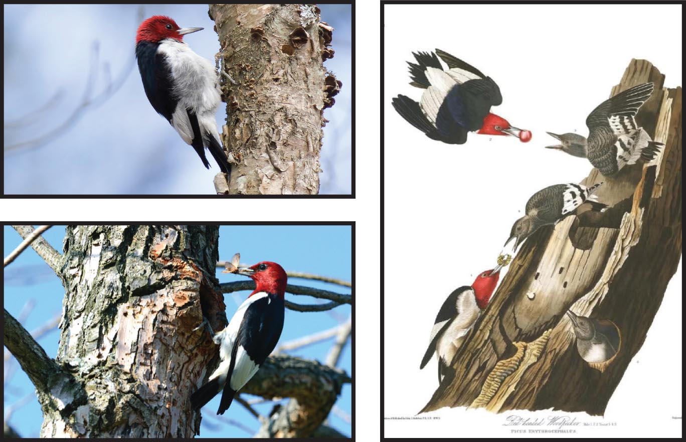 Red-headed Woodpecker - Ross Feldner This starkly-tricolored bird is one of only four North American woodpeckers that store food. But it goes one step further and covers the stored food with wood or bark. It will also hide seeds and insects under bark, under roof shingles and in cracks in wood. Red-headed Woodpeckers eat insects, fruits, seeds, nuts, berries and even small rodents. Their breeding habitat is open country across the east-central United States and southern Canada. Once they establish their territory the female chooses the location of the nesting cavity alerting her mate to it by tapping on the site. Both parents drill out the nesting cavity with the male doing most of the work. They excavate in dead trees and utility poles. Both parents care for the young which stay in the nest for about a month. Red-headed Woodpeckers are prolific breeders usually starting a second brood as soon as the first brood leaves the nest. Fledglings are proficient flyers, and most are able to feed and care for themselves without too much help from their parents. The Red-headed Woodpecker makes an appearance in Longfellow’s epic poem "The Song of Hiawatha," telling how a grateful Hiawatha gave the bird its red head in thanks for its service. Other homage includes a 2-cent stamp issued by the USPS in 1996 depicting a perched Red-headed Woodpecker. It was listed as “near threatened” in 2004 after experiencing a 65% decline in population over 40 years mostly due to habitat loss. Increased habitat management has helped stabilize their numbers. | |