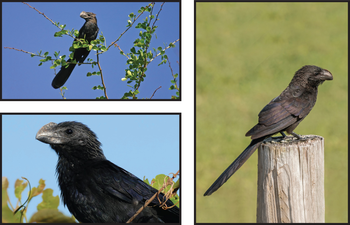 Smooth-billed Ani - Ross Feldner In my quest for the rare and unusual I found this member of the cuckoo family with a magnificent proboscis. Only seen in the United States in southern Florida in open and semi-open country, the Smooth-billed Ani is one of the few bird species that has actually benefited from deforestation. It has proved to have an exceptional capacity for adaptation to new environments. Smooth-billed Anis are always found in gregarious, noisy groups foraging for insects. In pastures, they will follow cattle and catch the insects they flush out. They forage on the ground and in bushes, running and hopping awkwardly with one member of the group perching up high as a lookout for danger. Its flight is weak and wobbly, but this bird runs well, usually feeding on the ground. Its diet is mostly insects including grasshoppers, beetles, moths, and caterpillars. But it will also eat small fruits, seeds and berries. They are community nesters with as many as five pairs working together to build one large nest where all the adults help incubate the eggs and care for the young. The nest is a bulky bowl of weeds and twigs, lined with leaves and usually built in a dense shrub. Early naturalists failed to find the ani in Florida but it became a regular nester during the 1930s after a series of hurricanes.and remained common for several decades. Currently their fate in Florida is tenuous and they are becoming increasingly scarce although their global population is stable. |