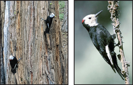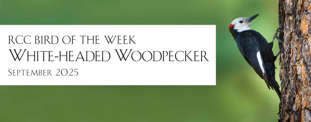 White-headed Woodpecker - Ross Feldner This medium-sized uniquely colored woodpecker lives in the pine forests of the mountains of western United States. White-headed Woodpeckers typically roost in cavities, usually in ponderosa pines, but also roost in spaces behind peeling bark and in crevices within tree trunks. Cavities are also used as winter roosts, and frequently the same cavity is used over an entire season. White-headed Woodpeckers use both live and dead trees for foraging. Pine seeds from large cones are a major part of the species diet, especially in fall and winter. They will also flake off bark to snatch insects. Unlike other woodpeckers they don’t drill holes into trees, which may explain why they have a shorter tongue than most woodpeckers. They forage methodically, often remaining on a single tree for extended periods. White-headed Woodpeckers have a unique adaptation that allows them to store pine seeds in their expandable esophagus. It is considered a rare species with a shrinking population mostly due to its dependence on mature, healthy pine forests. They are vulnerable to extended droughts, logging, forest fires, and bark beetle infestations of pine trees. White-headed Woodpeckers have a long rattling, chattering call, as well as a crisp staccato pik call, typically given two or three times. | |